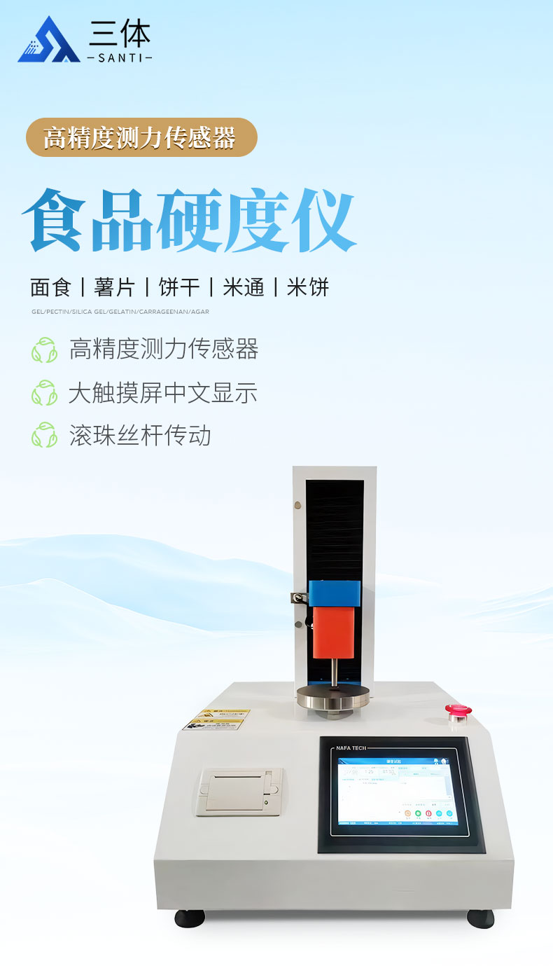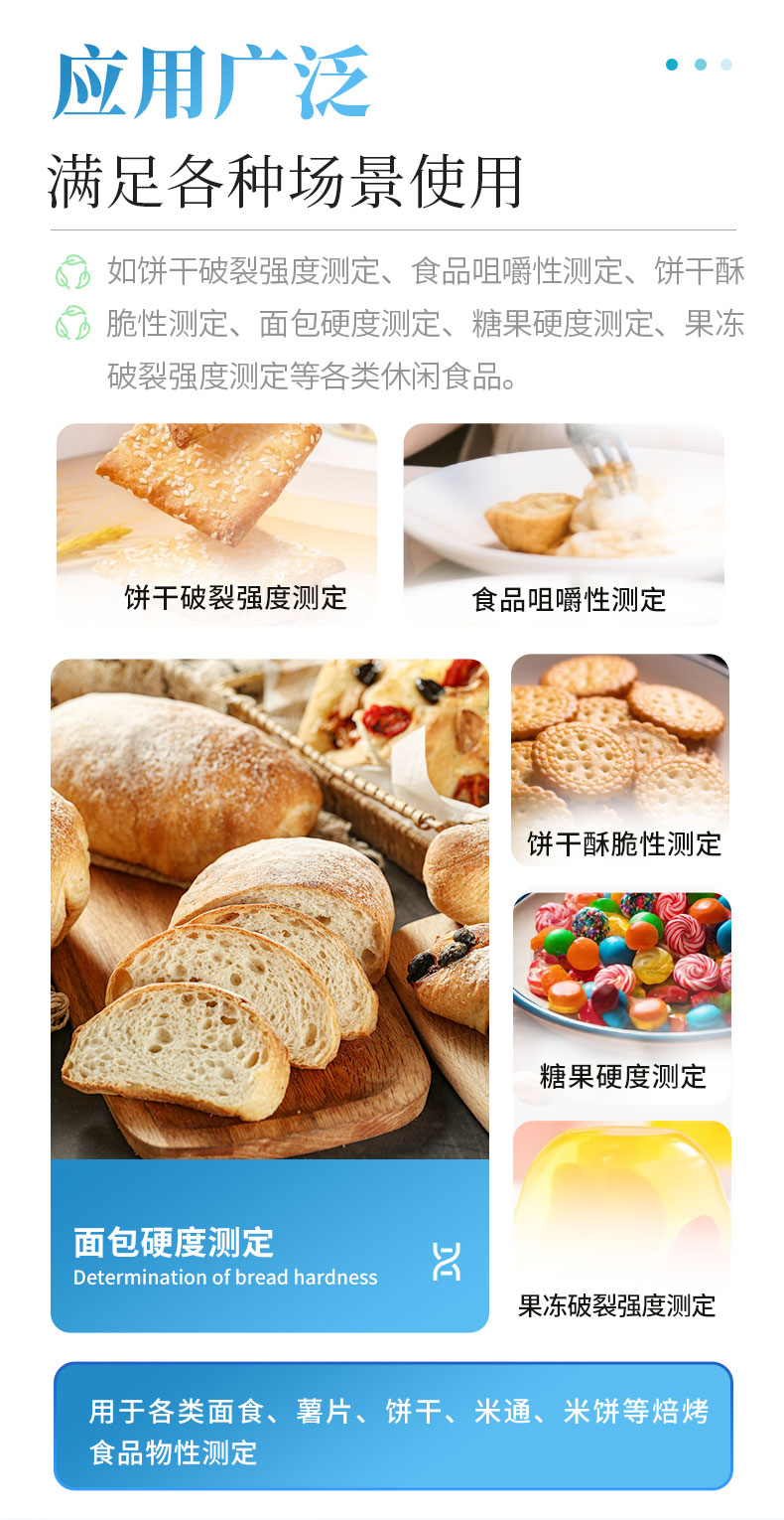 食品硬度儀適用于各類面食、薯片、餅干、米通、米餅等焙烤食品物性測定,如餅干破裂強(qiáng)度測定、食品咀嚼性測定、餅干酥脆性測定、面包硬度測定、糖果硬度測定、果凍破裂強(qiáng)度測定等各類休閑食品。