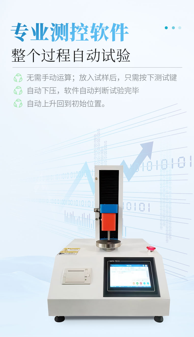 7、軟件:專業(yè)測控軟件,整個(gè)過程自動(dòng)試驗(yàn),無需手動(dòng)運(yùn)算;放入試樣后,只需按下測試鍵,自動(dòng)下壓,軟件自動(dòng)判斷試驗(yàn)完畢,自動(dòng)上升回到初始位置。