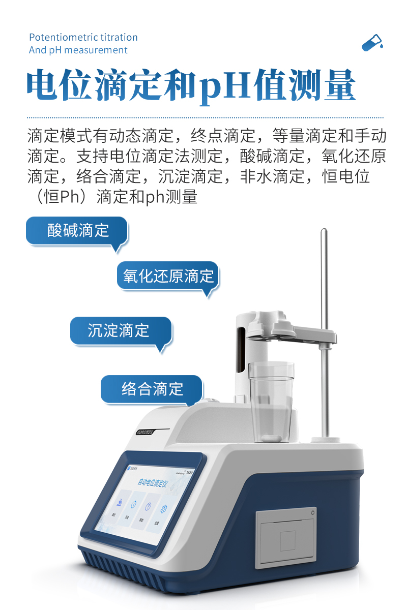 自動電位滴定儀是一種用于化學分析的精密儀器,他通過自動添加滴定劑來確定樣品中特定成分的濃度。該儀器基于電位滴定原理工作,即根據(jù)在滴定過程中電池電動勢的變化來確定滴定終點的一款滴定設(shè)備。設(shè)備滿足國家檢定規(guī)程JJG 814-2015《自動電位滴定儀》儀器級別中的0.05級別,即儀器**示值誤差為±1.5%,儀器示值重復性≤0.2%