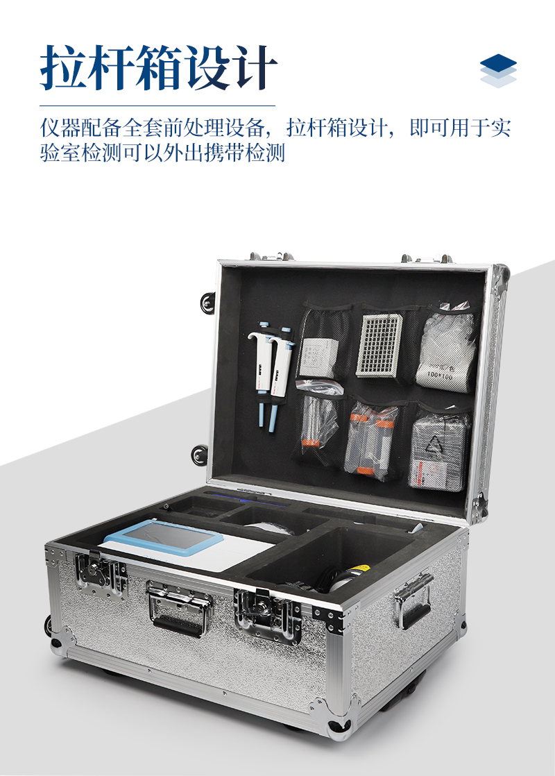 12、儀器配備全套前處理設(shè)備,拉桿箱設(shè)計(jì),即可用于實(shí)驗(yàn)室檢測可以外出攜帶檢測。