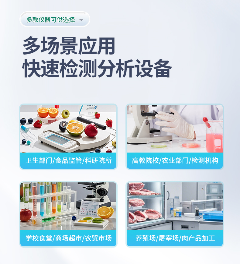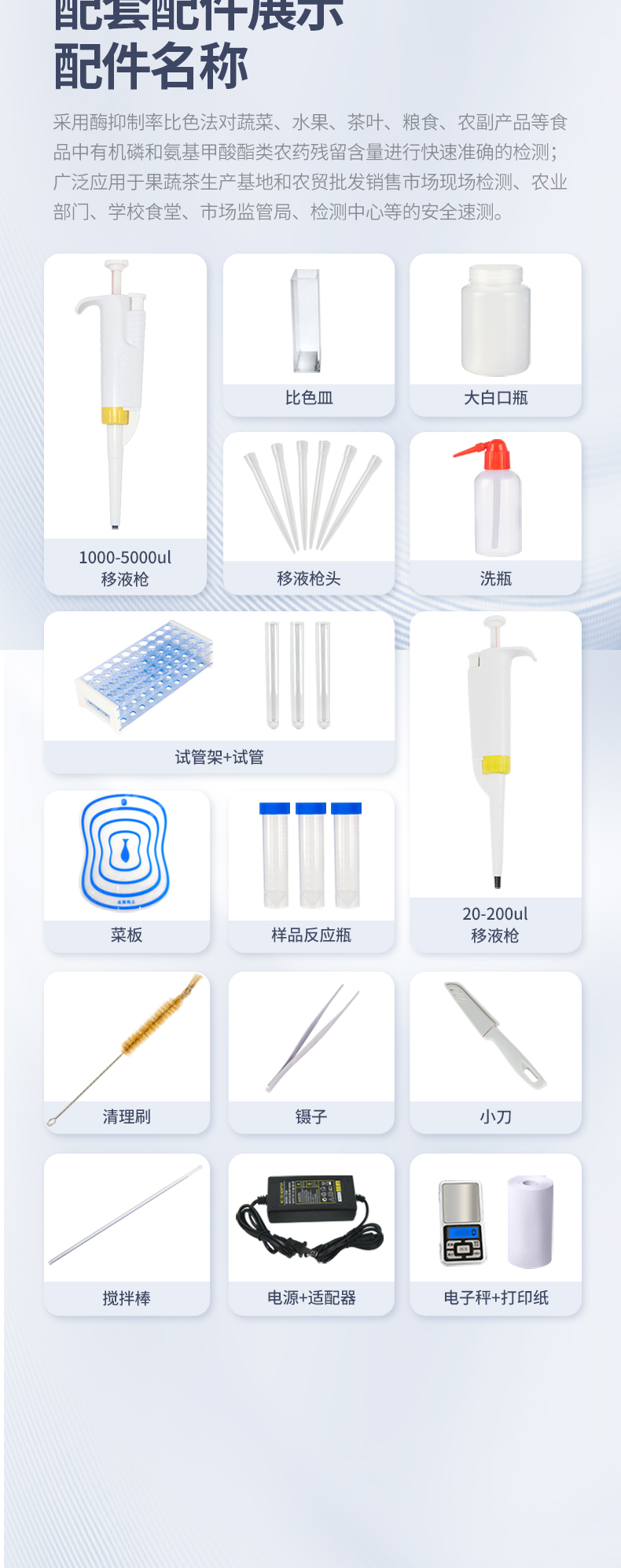 采用酶抑制率比色法對蔬菜、水果、茶葉、糧食、農(nóng)副產(chǎn)品等食品中有機磷和氨基甲酸酯類農(nóng)藥殘留含量進(jìn)行快速準(zhǔn)確的檢測;廣泛應(yīng)用于果蔬茶生產(chǎn)基地和農(nóng)貿(mào)批發(fā)銷售市場現(xiàn)場檢測、農(nóng)業(yè)部門、學(xué)校食堂、市場監(jiān)管局、檢測中心等的安全速測。