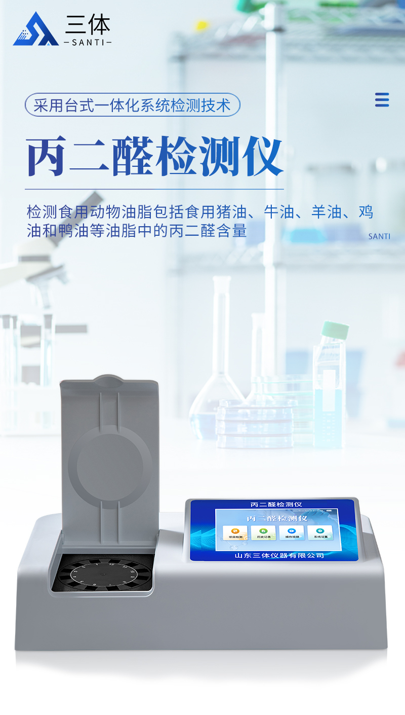 山東三體儀器有限公司生產(chǎn)的丙二醛檢測儀為集成化食品安全快速檢測分析設(shè)備,采用臺式一體化設(shè)計,能夠快速檢測食用動物油脂包括食用豬油、牛油、羊油、雞油和鴨油等油脂中的丙二醛含量;儀器預(yù)留其他項目檢測程序和端口,根據(jù)日后需求可進行遠程升級